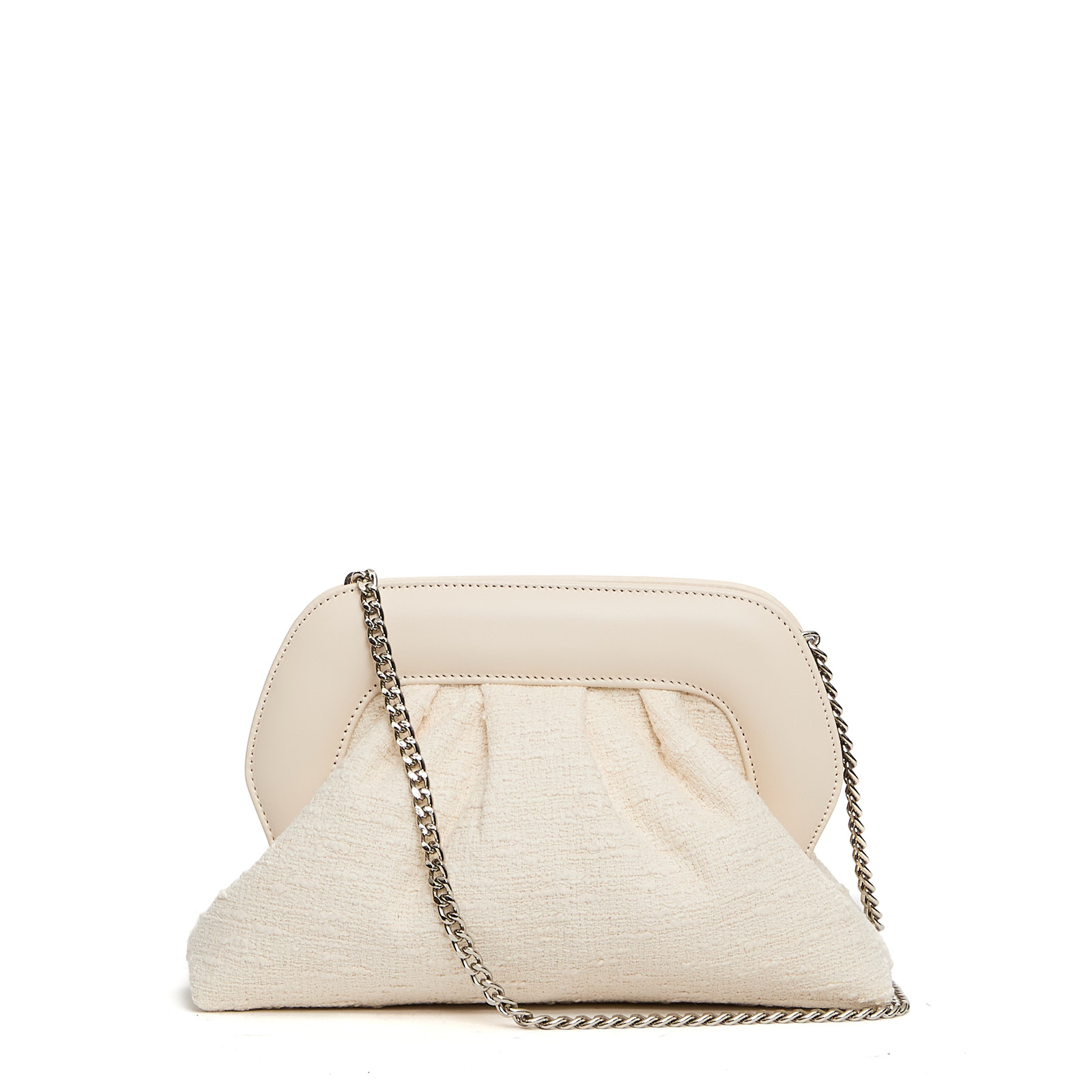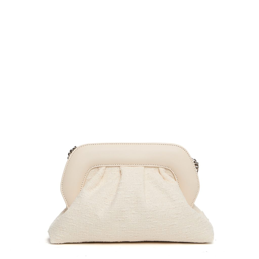 Realizzata in tessuto effetto bouclè e pelle panna.