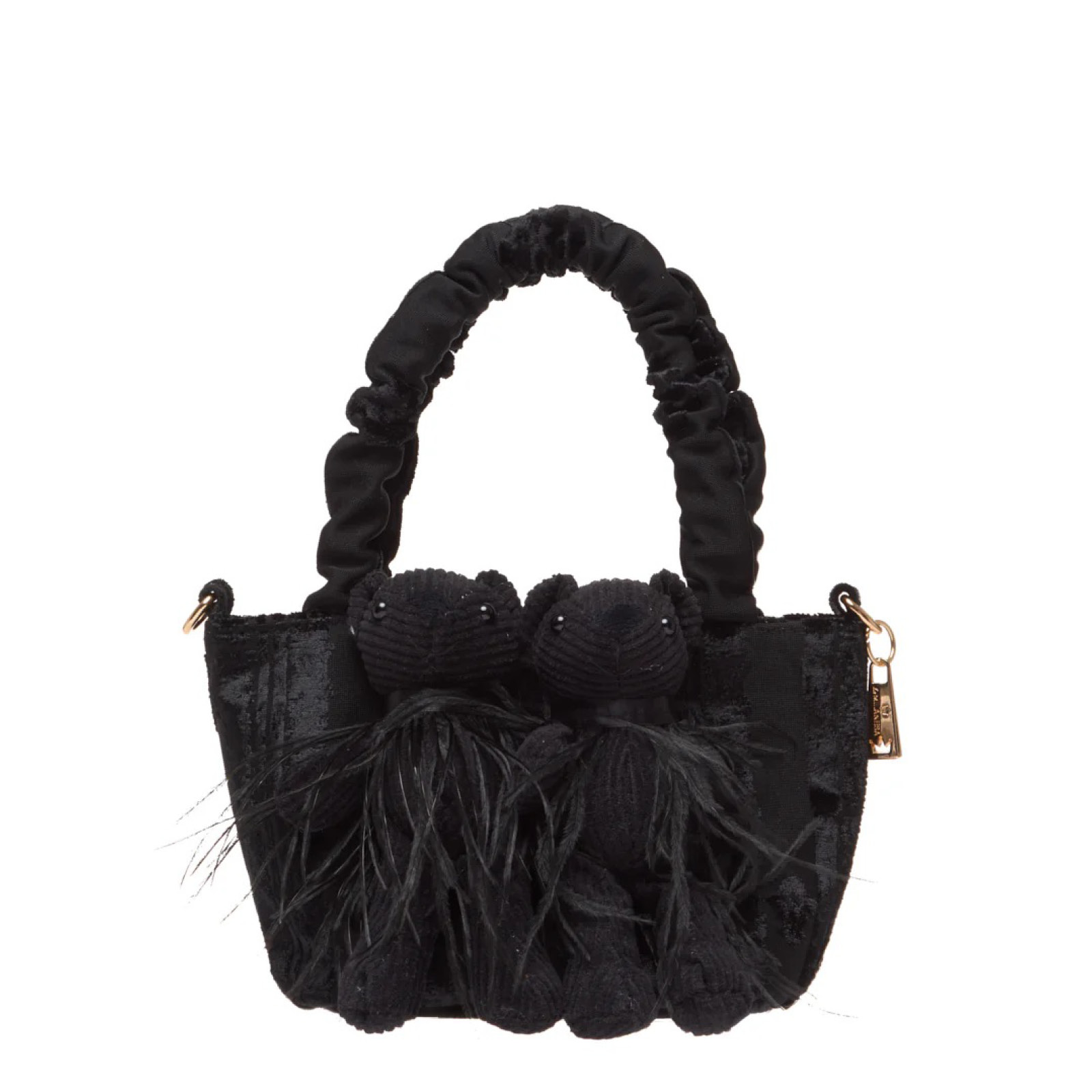 Applicazioni: Sul fronte della borsa due orsetti realizzati in velluto e marabu.