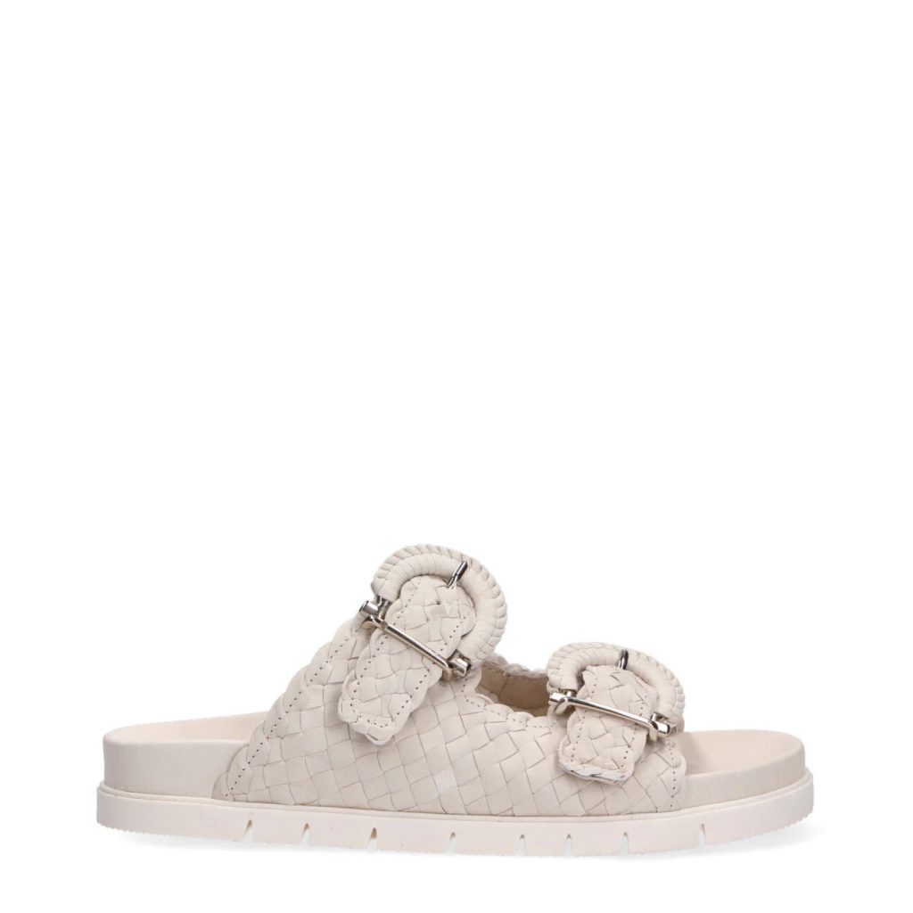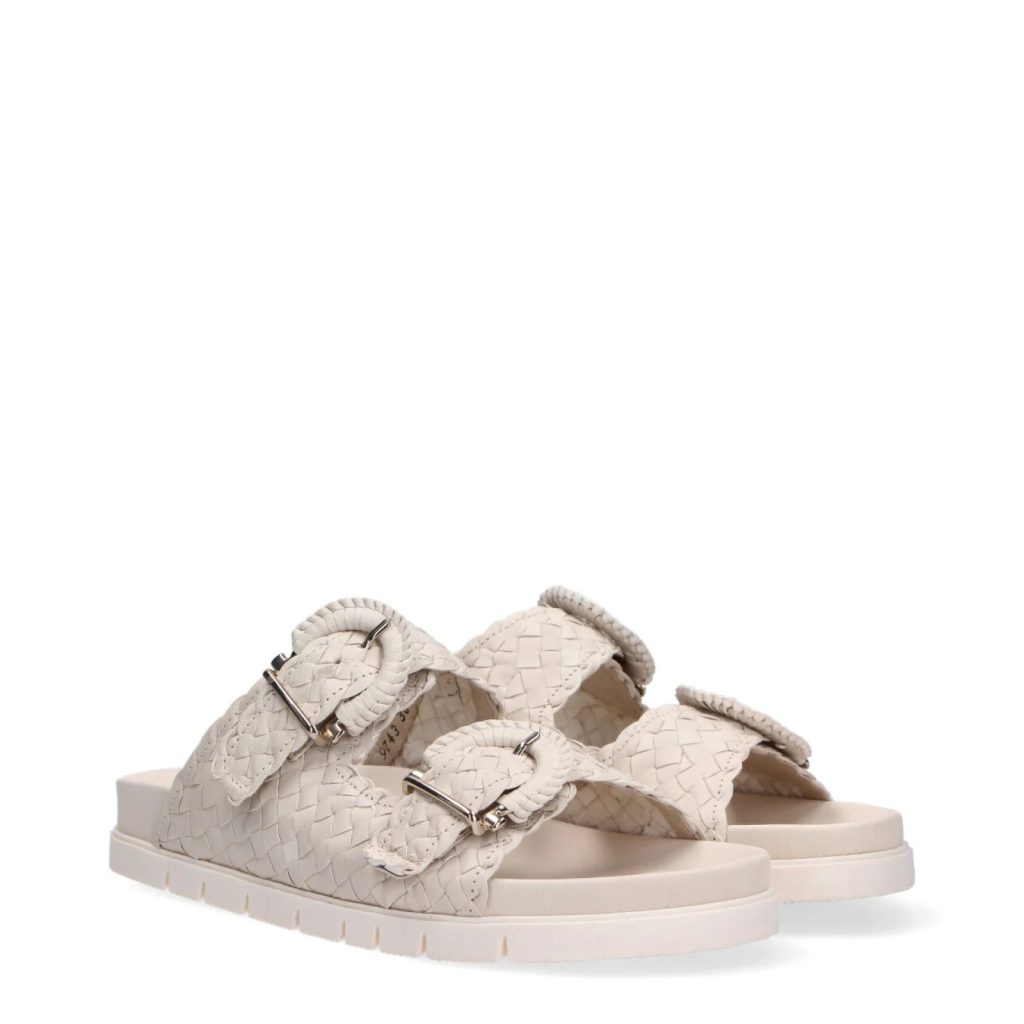 Ciabatta a due fasce in pelle intrecciata panna
