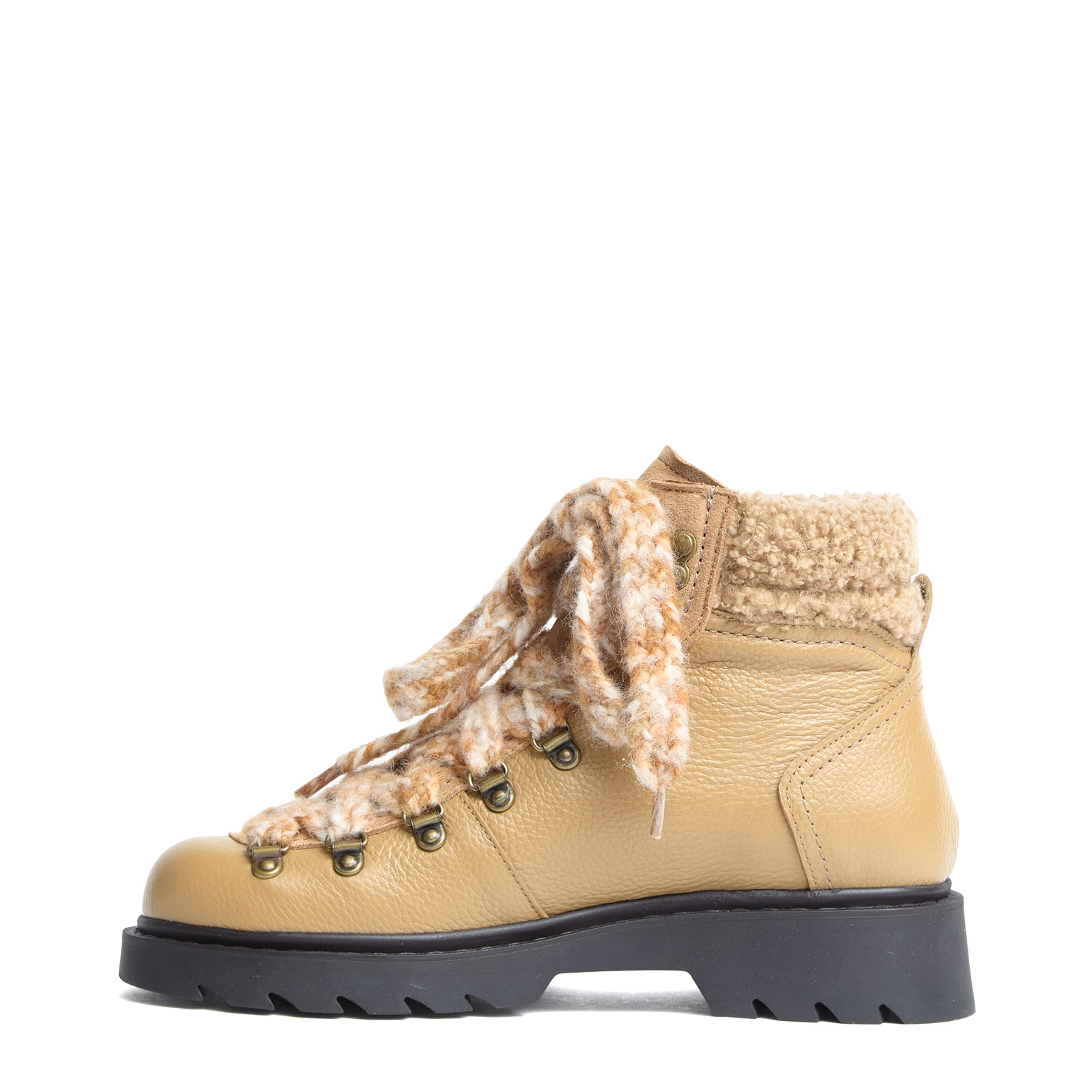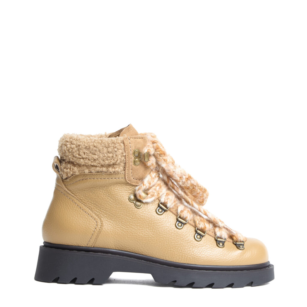 Dettaglo sulla caviglia in teddy beige.