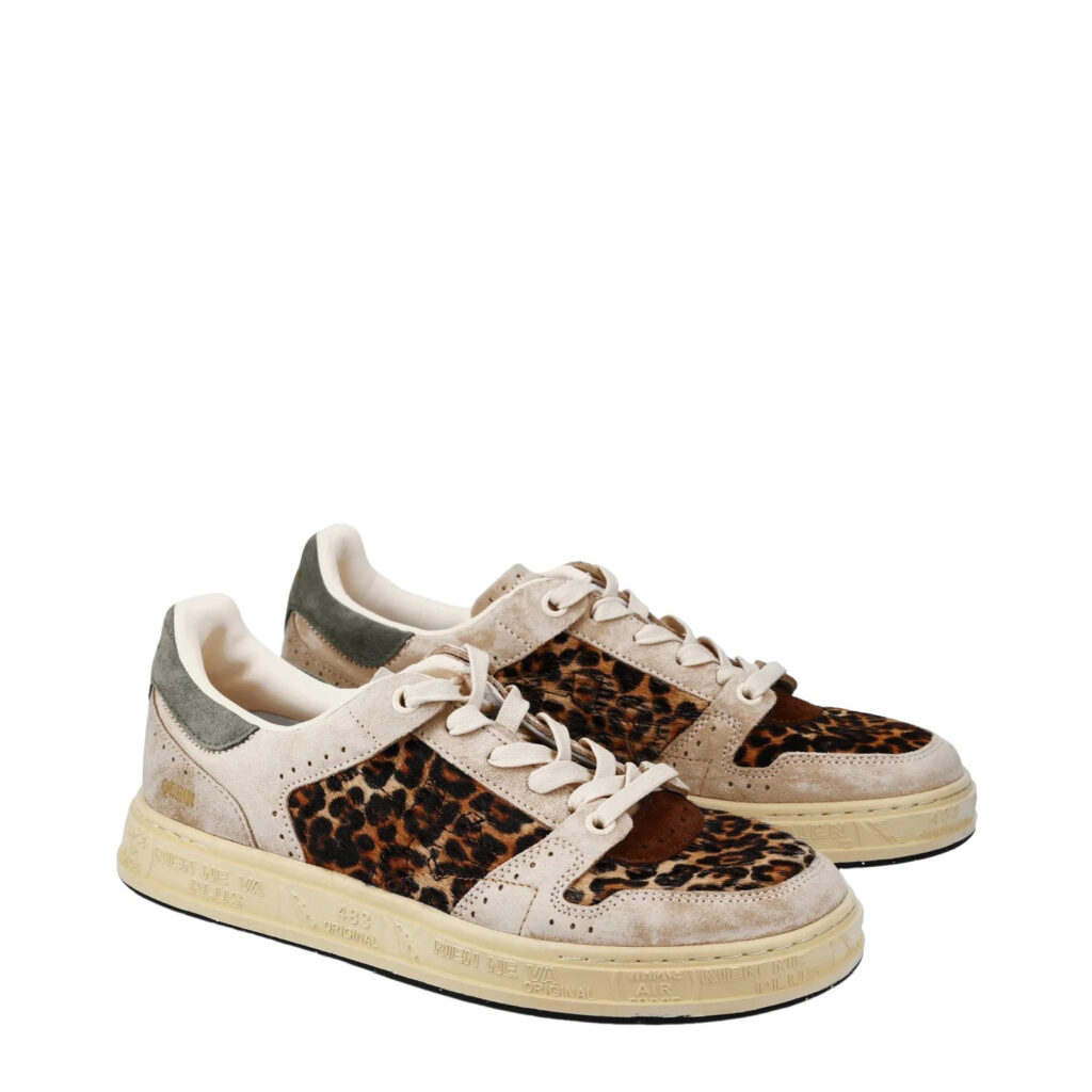 Sneakers Queen 7647 in pelle scamosciata beige e pelle effetto cavallino maculato